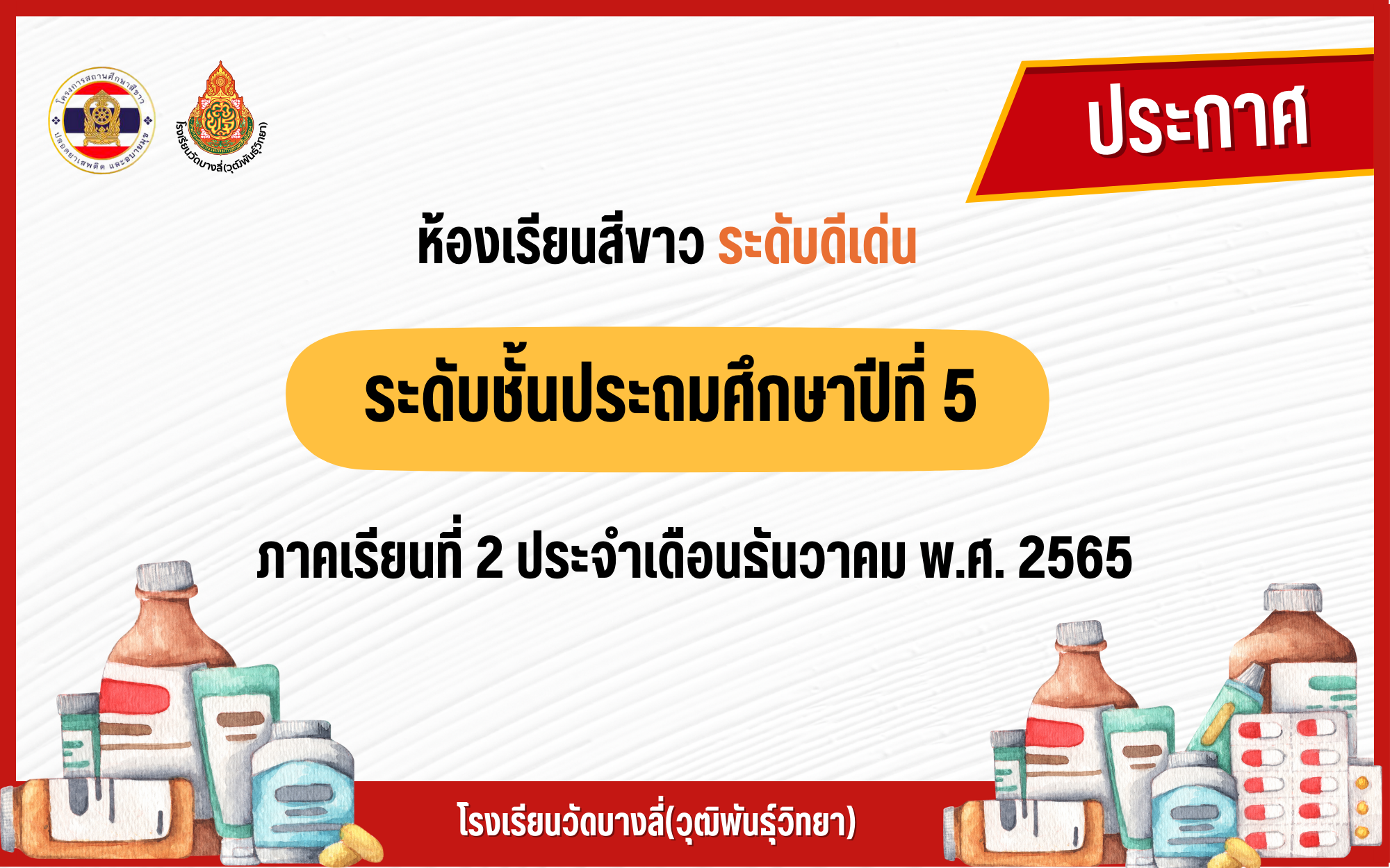 ประกาศห้องเรียนที่ได้รับเลือกเป็นห้องเรียนสีขาวระดับดีเด่นประจำภาคเรียนที่ 2 เดือนธันวาคม ระดับชั้นประถมศึกษา ได้แก่ชั้นประถมศึกษาปีที่ 5 ระดับมัธยมศึกษา ได้แก่ชั้นมัธยมศึกษาปีที่ 2